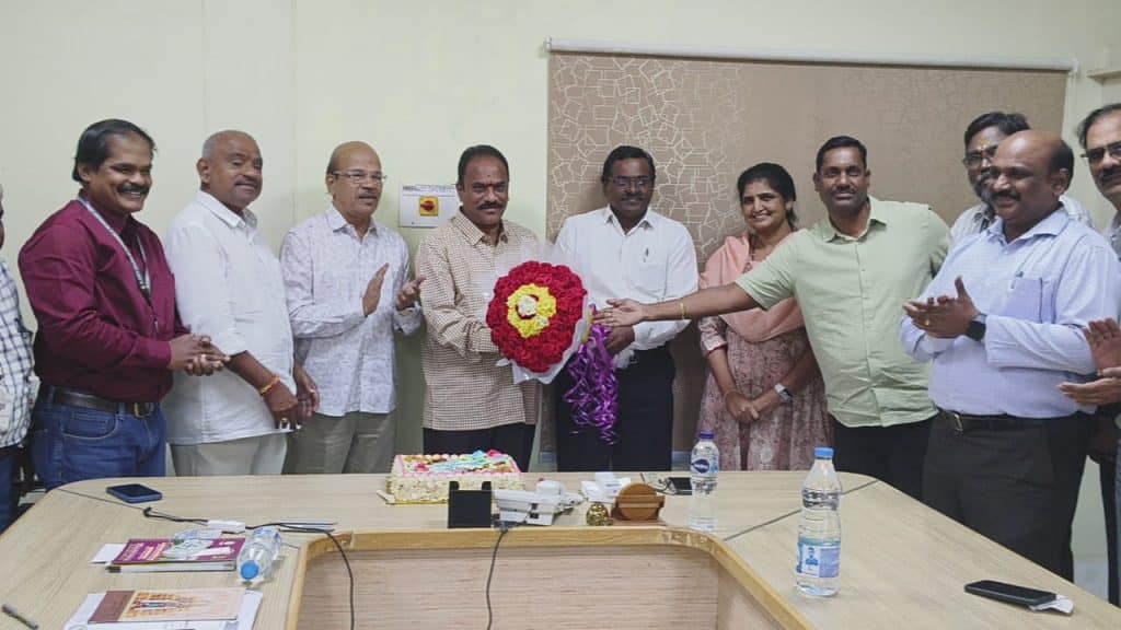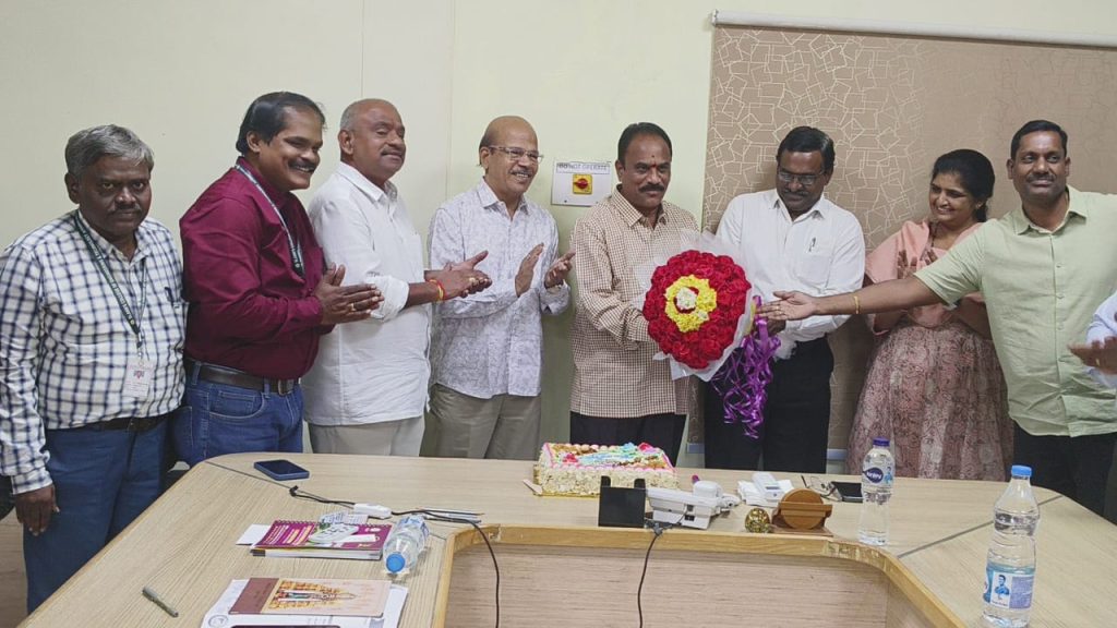 College Principal Dr. K. Jagadeesh Babu, Manager R.V. Ramana Murthy, Director of Accreditations Dr. C.S. Rao, and various Heads of Departments — P. Harini, R. Rajendra Prasad, S.V.D. Anil, C. Harikishan, K. Vijayabhaskar Reddy, K. Subbarao, Emmanuel, Amarnath, Indranil, T. Kiran Kumar, and Lakshmi Tulasi, along with Physical Director Annam Srinivasa Rao, faculty members, non-teaching staff, and students — congratulated the Secretary with flower bouquets.